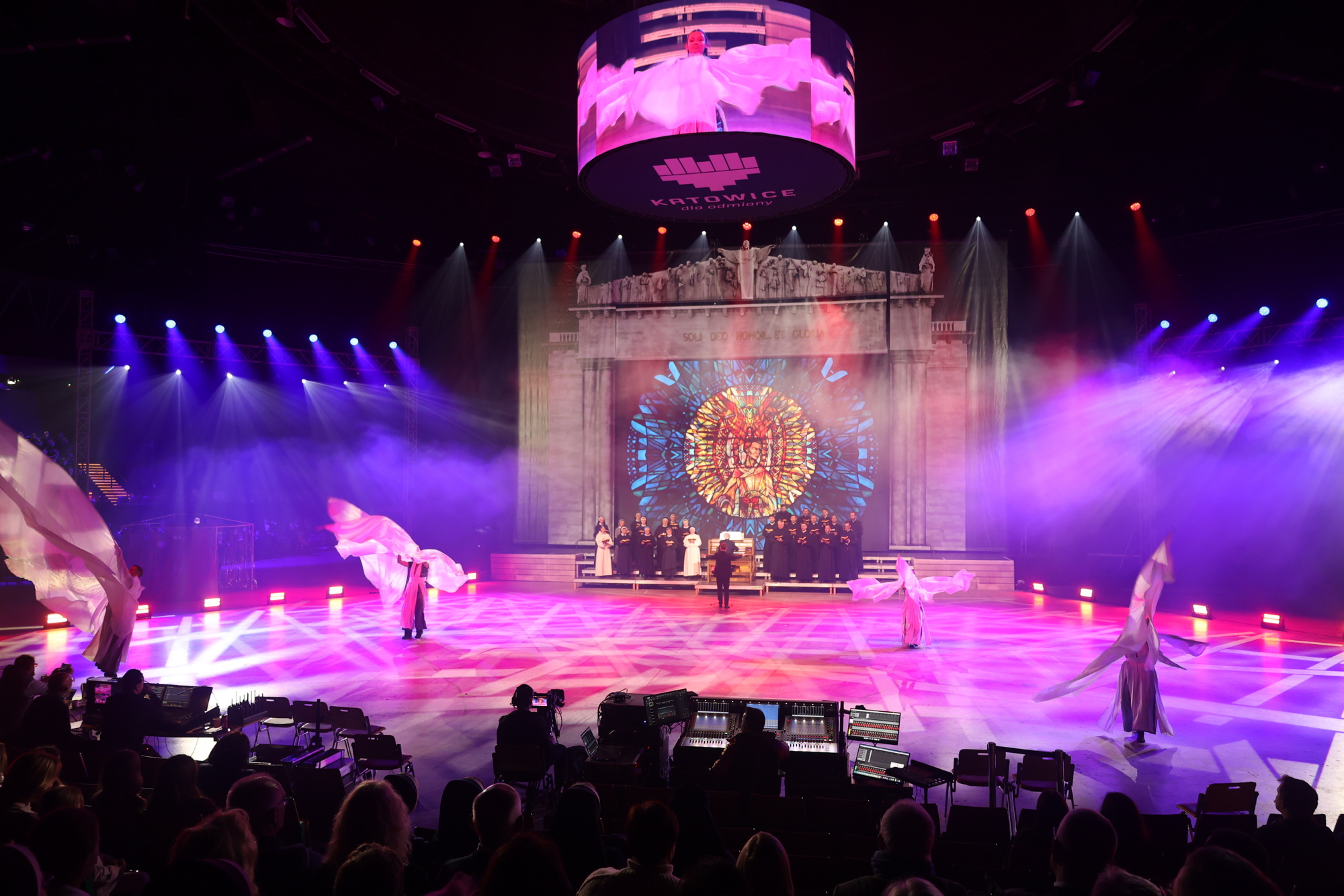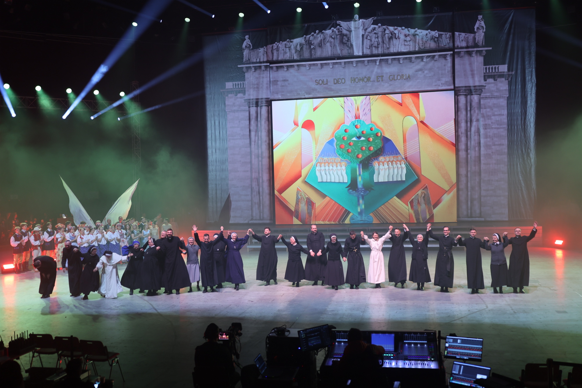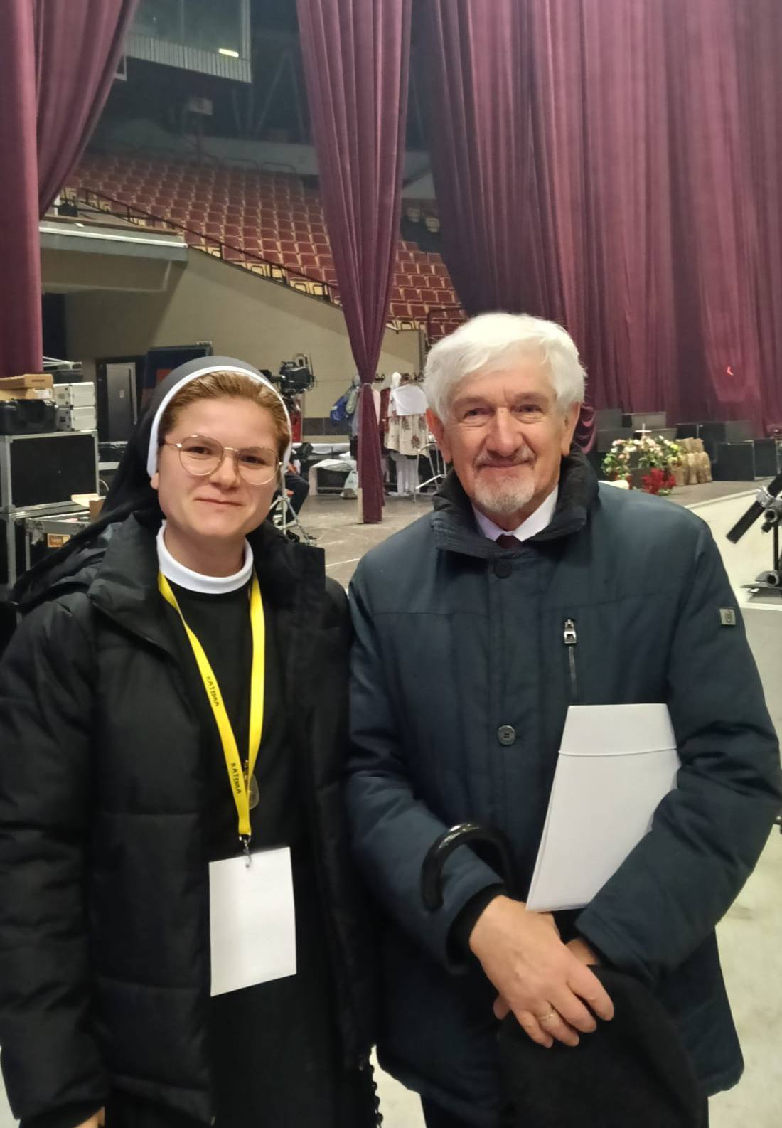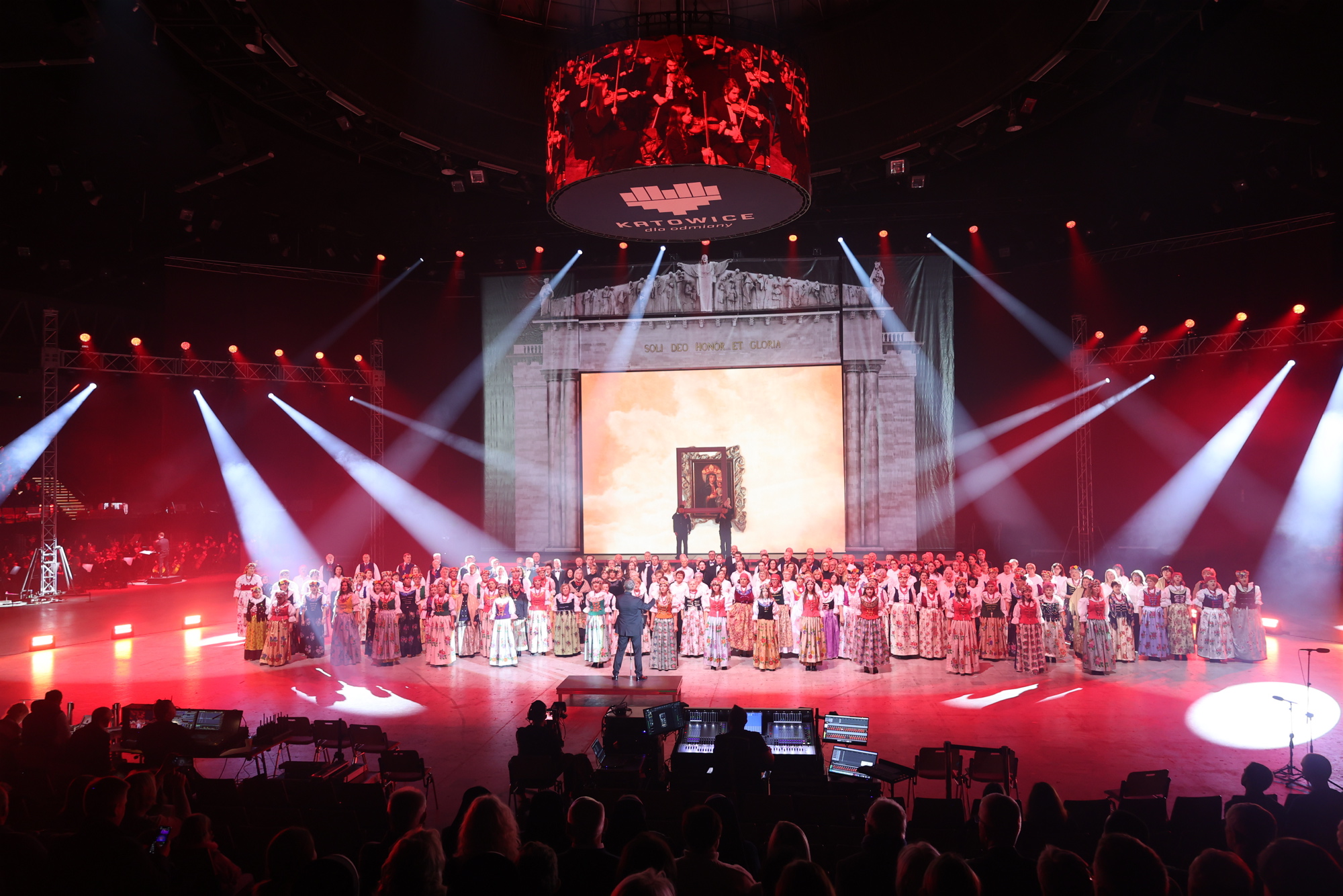 W środę 26 listopada br., Katowicki Spodek zamienił się  w monumentalną scenę, która stała się tłem dla jednego z najważniejszych wydarzeń artystycznych tego roku – widowiska „Katedra”, zamykającego obchody 100-lecia Archidiecezji Katowickiej. Był to imponujący spektakl, łączący światło, dźwięk, taniec i duchową głębię. Już od wczesnych godzin porannych nasze Siostry S. M. Natalia i s. Maria uczestniczyły w ostatnich przygotowaniach do wydarzenia w Spodku. Znalazły się w grupie sióstr zakonnych różnych zgromadzeń, które współtworzyły jedno z najbardziej poruszających momentów wieczoru. Widowisko „Katedra” okazało się nie tylko dziełem sztuki scenicznej, ale także głębokim świadectwem wiary i tożsamości Śląska. W kilkunastu sugestywnych scenach artyści – zarówno zawodowi, jak i amatorzy – poprowadzili publiczność przez historię regionu, osnutą wokół chrześcijańskich wartości i śląskiej tradycji. Na scenie pojawiło się ponad 600 wykonawców, w tym orkiestra symfoniczna, chóry, zespoły taneczne, a także osoby z różnych środowisk, w tym z niepełnosprawnościami. Nie zabrakło również wyjątkowych gości, podczas prób udało się spotkać  prof. Juliana Gembalskiego, znanego i cenionego organistę, który podczas widowiska wystąpił wraz z Orkiestrą Symfoniczną Afidare Musicae.  Reżyserem widowiska był Mariusz Kozubek, a muzykę specjalnie na tę okazję skomponował Piotr Solorz. Choreografię przygotował Alberto Pecetto, nadając całości świeżości i ekspresji. Spektakl powstawał przez dwa lata, a jego twórcy połączyli siły środowisk artystycznych, społecznych i religijnych, tworząc wydarzenie, które trudno będzie zapomnieć.
