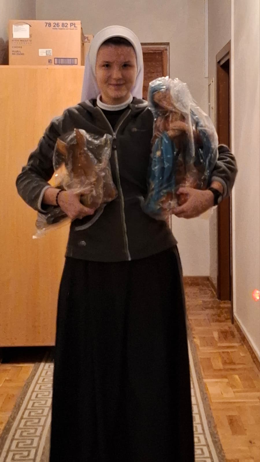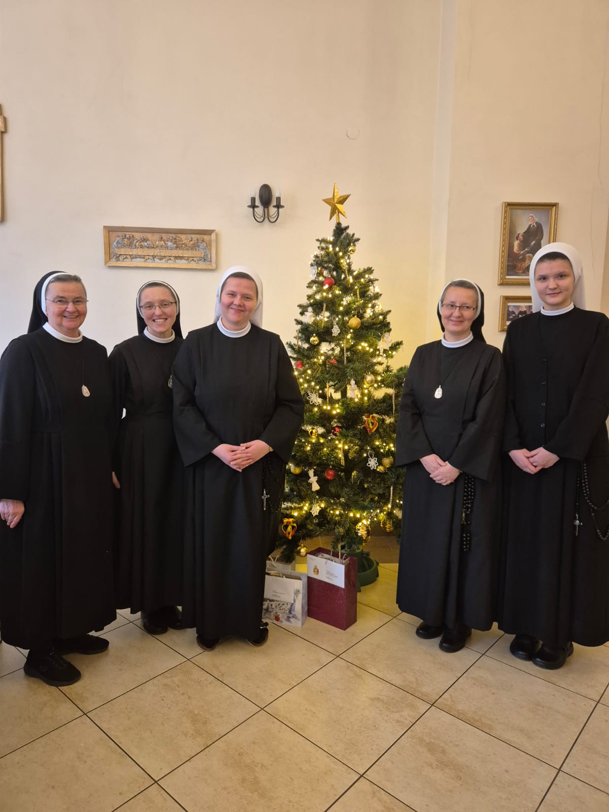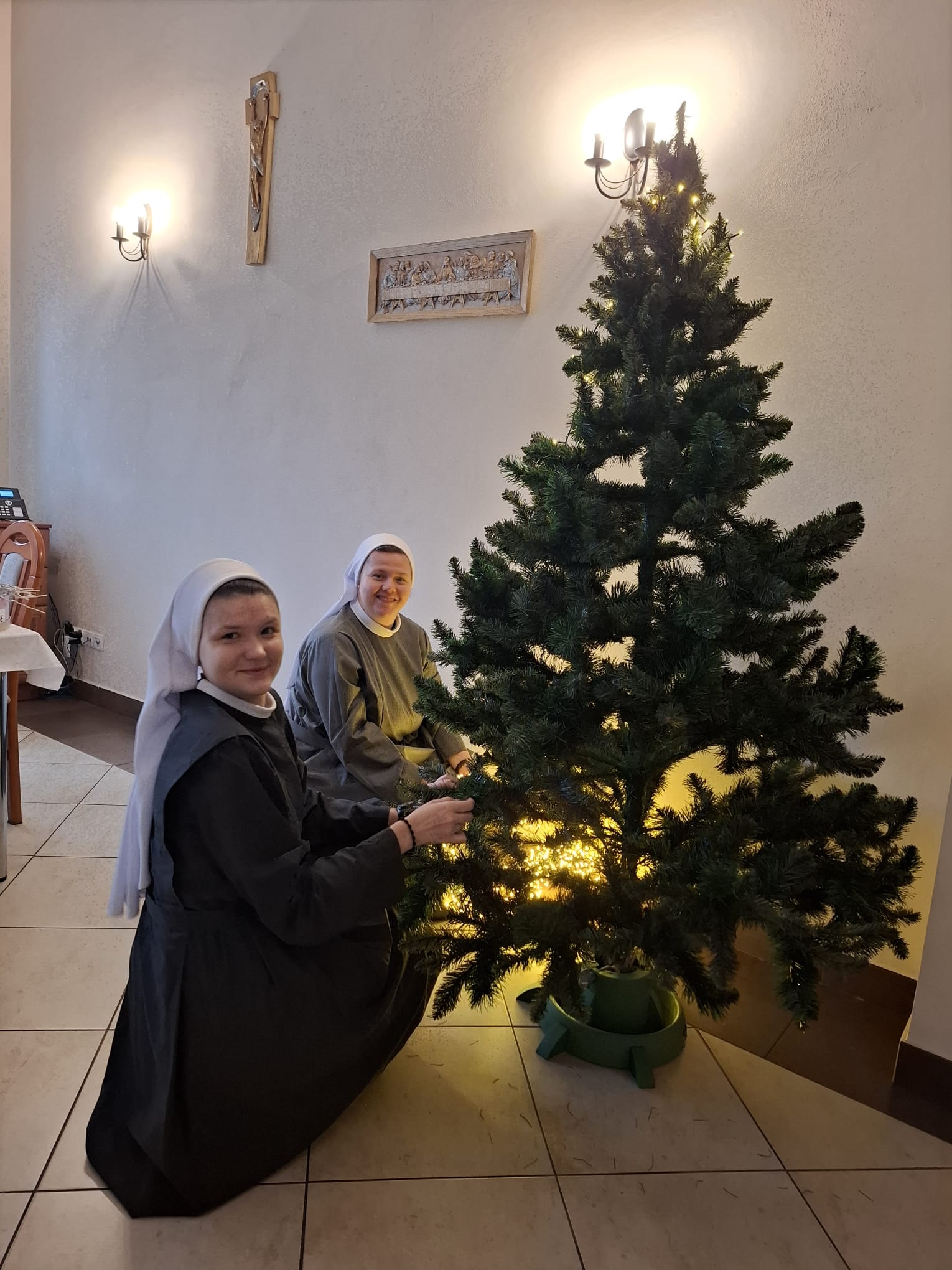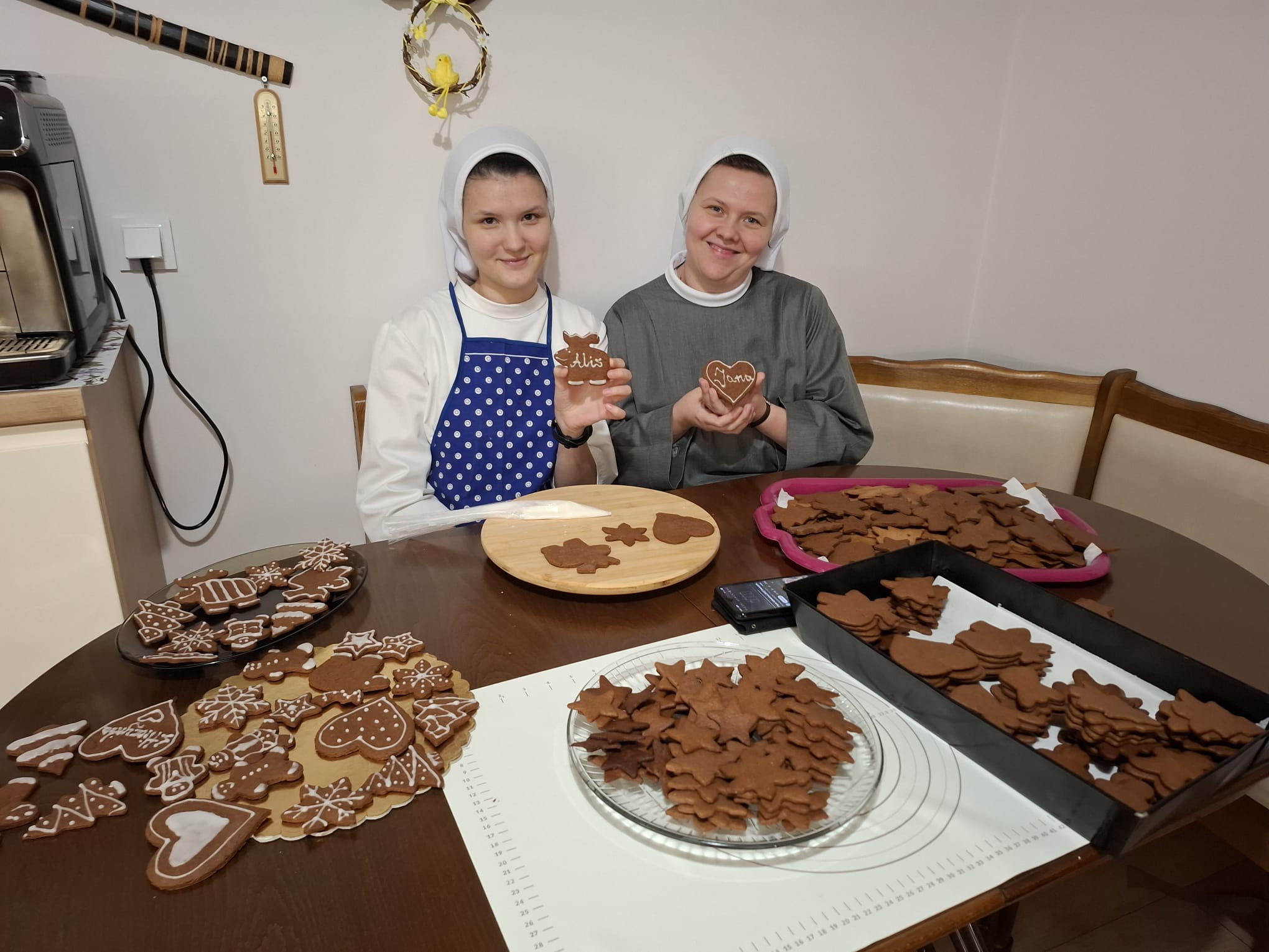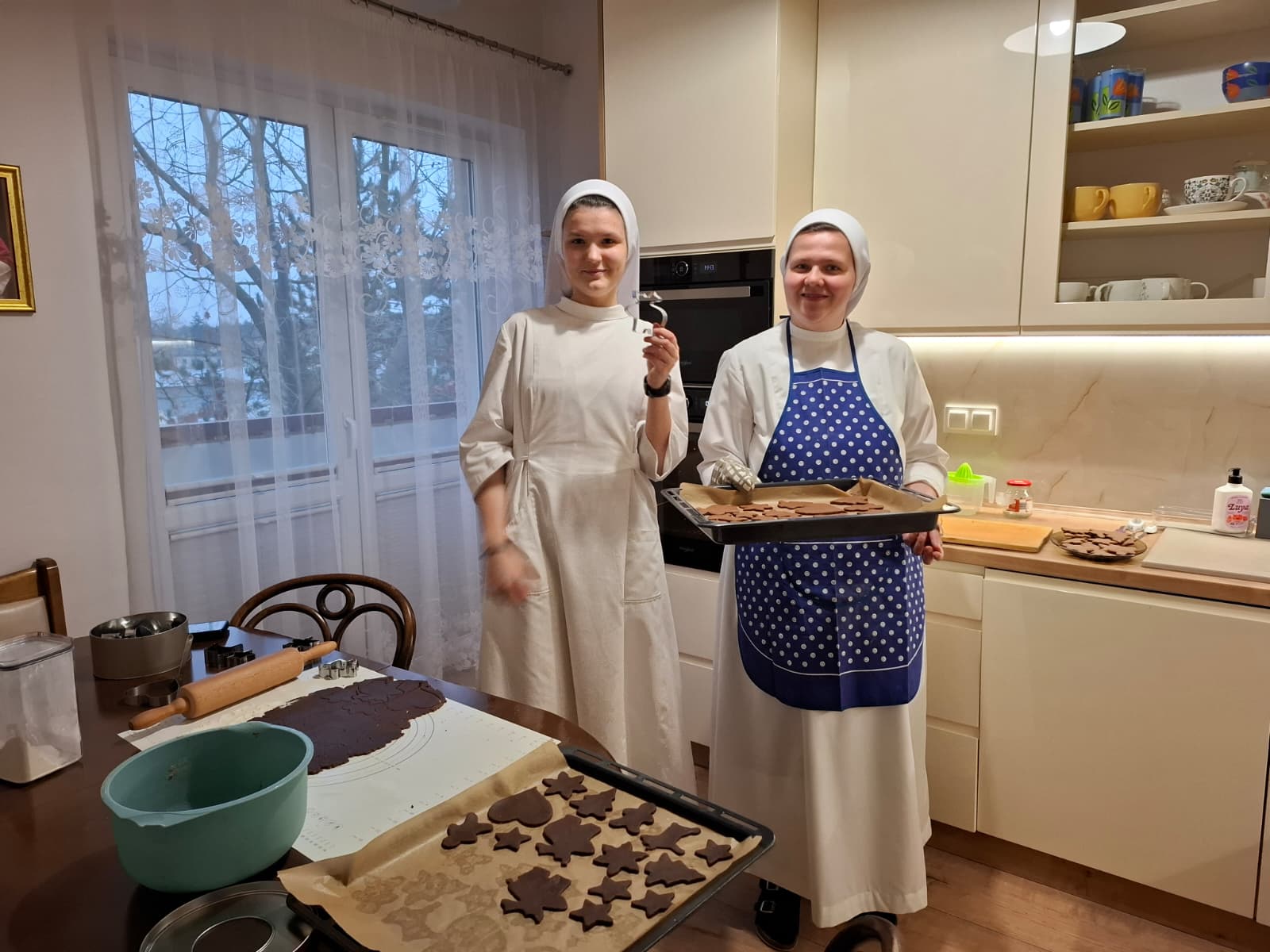 Ważnym elementem naszego nowicjackiego przeżywania Adwentu oprócz zwyczajnej codzienności był również wspólny czas spędzony przy pieczeniu pierniczków oraz przygotowywaniu drobnych prezentów dla naszych sióstr i wykładowców. Prosta praca, rozmowa i radość z bycia razem uczą nas uważnego słuchania siebie nawzajem, cierpliwości, współpracy, poznawania naszych zwyczajów i tradycji co pomaga nam rozwijać i umacniać nasze relacje w międzynarodowej wspólnocie. Świąteczną atmosferę do naszej wspólnoty przyniosły także przedświąteczne odwiedziny sióstr. W środę, 17 grudnia, gościłyśmy Siostrę Radną Generalną Patrycję Sobinek, z Prowincji Warszawskiej Siostrę Prowincjalną Samuelę Kamińską oraz Siostrę Wikarię Benedyktę Konobradzką, a z Prowincji Katowickiej Siostrę Mistrzynię Zofię Przybyłę oraz Siostrę Przełożoną Klarę Dercz z Ostrawy. Był to czas serdecznych spotkań, wspólnych rozmów i radości z bycia razem, który wypełnił naszą codzienność ciepłem i jeszcze bardziej przybliżył nas do przeżywania tajemnicy nadchodzących świąt. W duchu wzajemnej siostrzanej pomocy miałyśmy także okazję pomóc naszym starszym i chorym  Siostrom w Zalesiu Górnym w dekorowaniu ich domu na nadchodzące święta. Prosta, wspólna praca stała się kolejną przestrzenią budowania wspólnoty i radości z bycia dla siebie nawzajem.